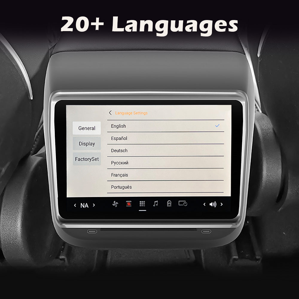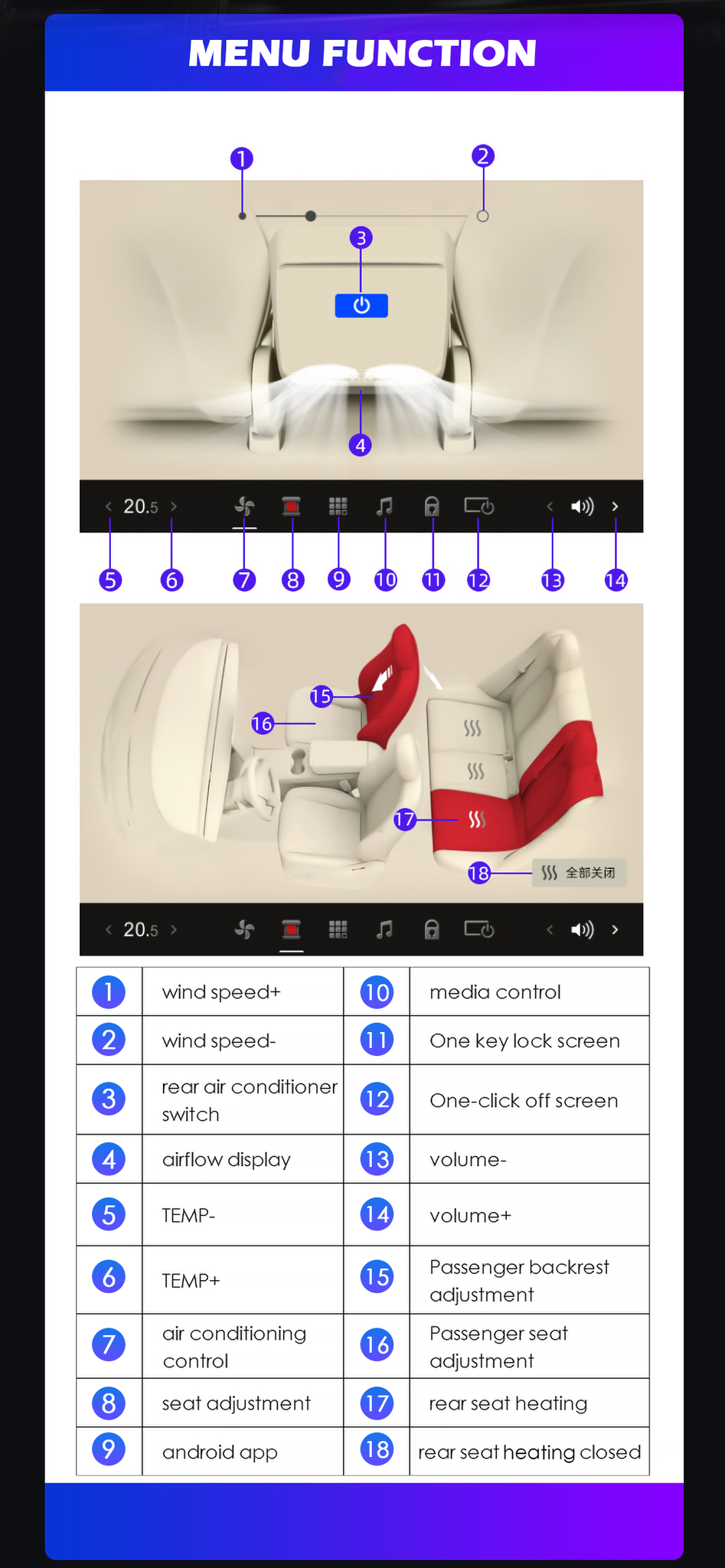 - Climate Adjustment: Control the main display for volume (up/ down) and play/ pause A/C climate control and wind speed adjustment. Rear passengers can now directly control the car's climate without bothering the driver to ensure safe driving.