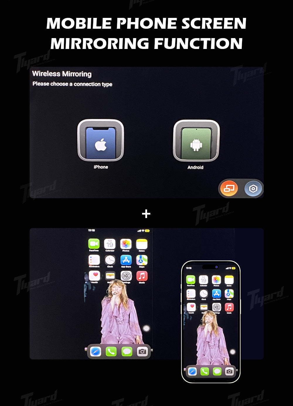 - Apple Car Play & Android Auto & Mirror Screen: Support wireless Apple Car Play & Android Auto. Support mobile phone mirror screen function.