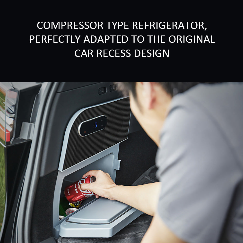 A must-have partner for outdoor enthusiasts! This car fridge is designed for Tesla Model Y and is perfect for traveling or camping. It makes full use of the hidden space of the storage slot of the trunk, perfectly fits the original car, and is non-destructive and easy to install, plug directly into the cigarette lighter port.