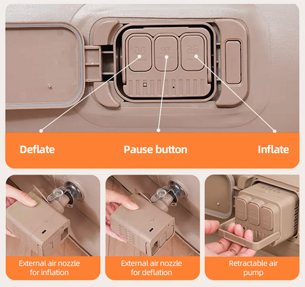 • Cordless Built-in Pump: Features an integrated rechargeable electric pump. No need for external power cords or car cigarette lighters—inflate or deflate with a single touch in under 3 minutes.