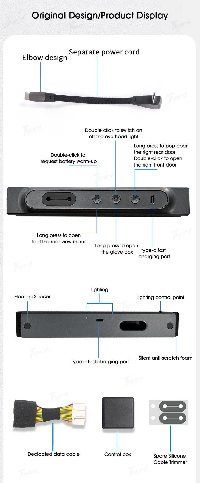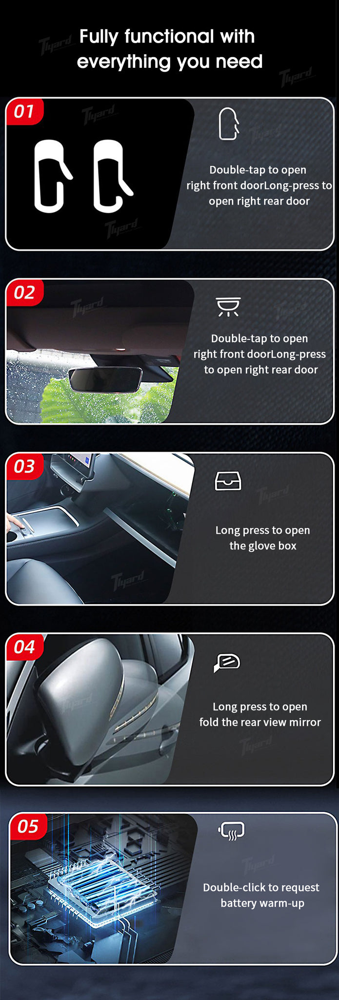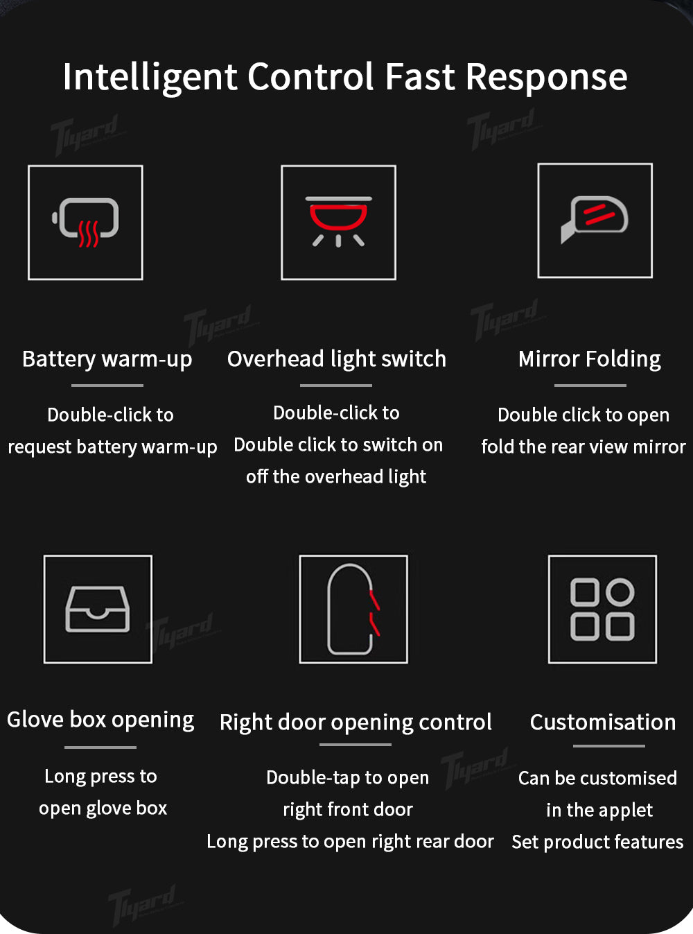 - 多功能控制:回應速度快,支援以下功能: a. 電池預熱;b. 彈出乘客門/右後門;c. 摺疊後視鏡;d. 開啟手套箱